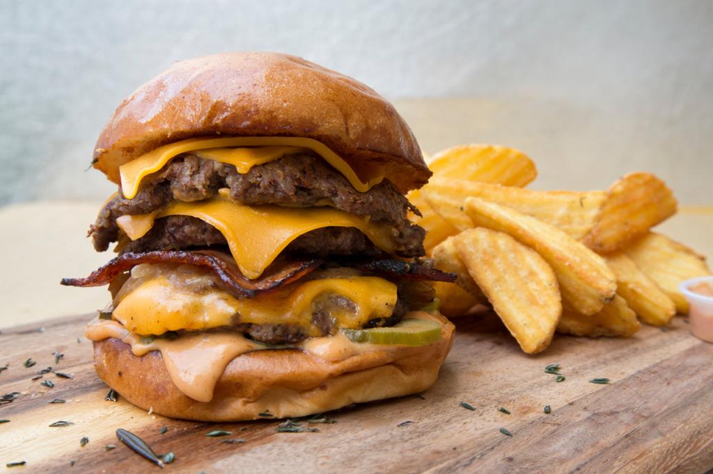 Hamburguesa completa triple con triple chedar, panceta y salsa barbacoa